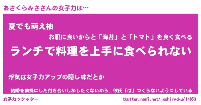 | ヘコむあだ名 | 『あさっふぃ~』『なまこ酢』 |