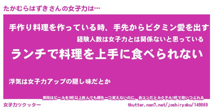 | 恥ずかしいあだ名 | 『プリティーたかむらはずき』『たかちん』 |