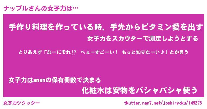 | 意味不明あだ名 | 『ペロリンナップル』『永久保存ナップル』 |