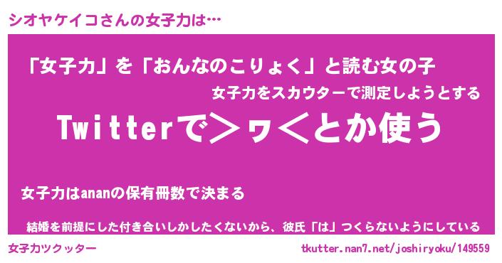 | 恥ずかしいあだ名 | 『プリティーシオヤケイコ』『シオっちょ』 |