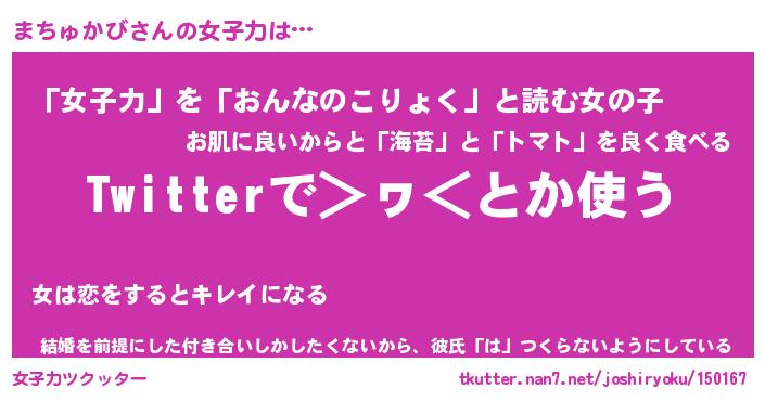 | 女子向けラノベタイトル風あだ名 | 『(仮)まちゅかびのやんごとなき事情』 |