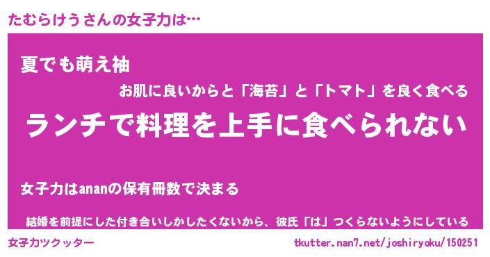| 恥ずかしいあだ名 | 『プリティーたむらけう』『たむっちょ』 |