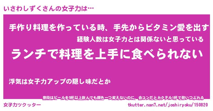 | ヒーロー風カッコイイあだ名 | 『スーパーイサワシズク』『黄金騎士イサ』 |