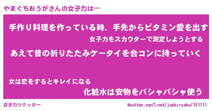 | 恥ずかしいあだ名 | 『プリティーやまぐちおうが』『やまちん』 |