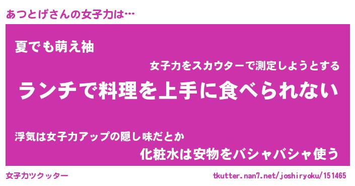 | 意味不明あだ名 | 『ペロリンあつとげ』『永久保存あつとげ』 |