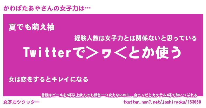 | 恥ずかしいあだ名 | 『プリティーかわばたあや』『かわっちょ』 |
