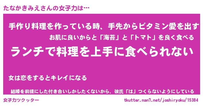 | 恥ずかしいあだ名 | 『プリティーたなかきみえ』『たなっちょ』 |