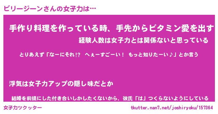 | ヘコむあだ名 | 『ビリふぇ~』『牛乳』『ビリお』 |