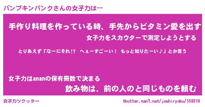 | 料理風あだ名 | 『ネギたっぷりパンプキンパンクの南蛮漬け』 |