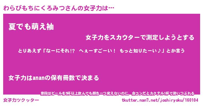 | 男性向けラノベタイトル風あだ名 | 『ワラビモチニクロミツアートオンライン』 |