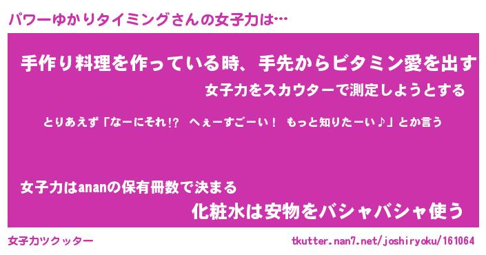 | 女子向けラノベタイトル風あだ名 | 『パワーゆかりタイミング姫と円卓の騎士』 |
