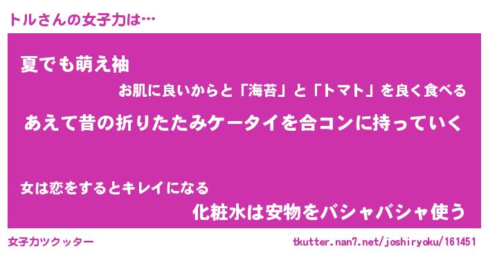 | 女子向けラノベタイトル風あだ名 | 『(仮)トルのやんごとなき事情』 |