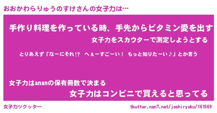 | 女子向けラノベタイトル風あだ名 | 『おおかわらりゅうのすけ姫と円卓の騎士』 |