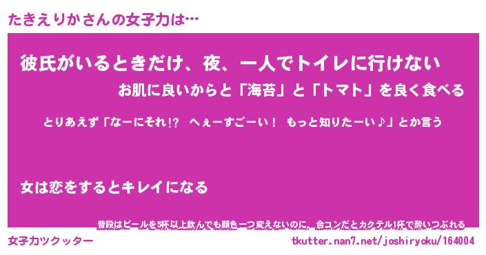 | 恥ずかしいあだ名 | 『プリティーたきえりか』『たきっちょ』 |