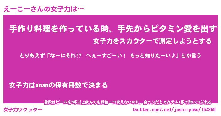 | 意味不明あだ名 | 『ペロリンえーこー』『永久保存えーこー』 |