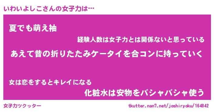 | ヒーロー風カッコイイあだ名 | 『スーパーイワイヨシコ』『魔戒騎士イワ』 |