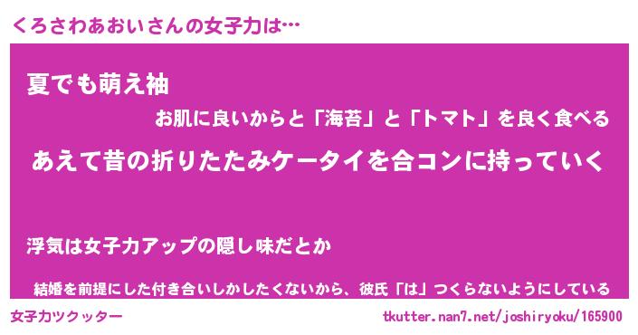 | 恥ずかしいあだ名 | 『プリティーくろさわあおい』『くろちん』 |