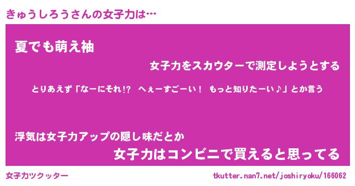| ヘコむあだ名 | 『きゅにー』『なまこ酢』『きゅ太郎』 |