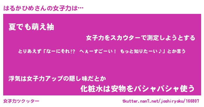 | 肩書あだ名 | 『はるかひめ店長』『はるかひめ総理大臣』 |