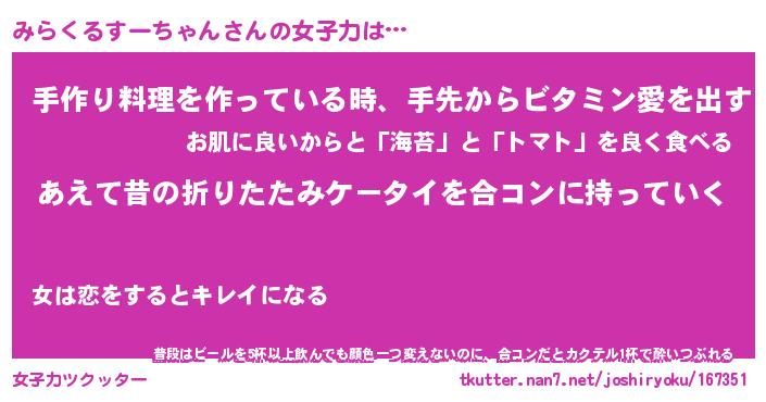 | ヘコむあだ名 | 『みらもー』『つくし』『みらっぺ』 |