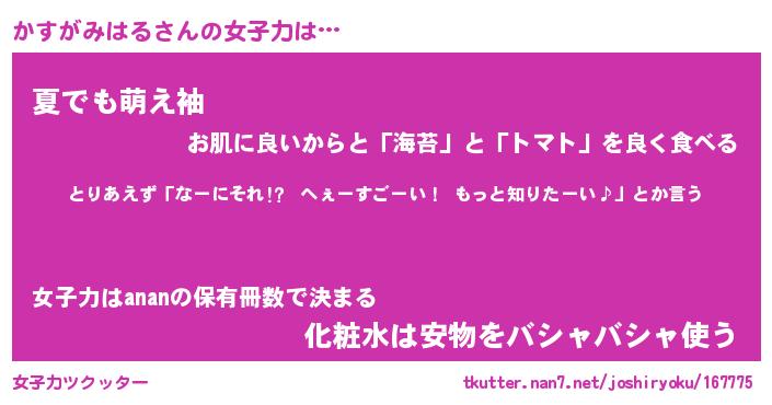 | 恥ずかしいあだ名 | 『プリティーかすがみはる』『かすっちょ』 |