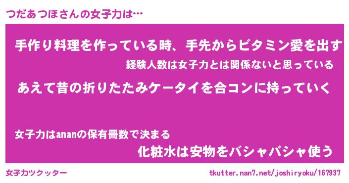 | 恥ずかしいあだ名 | 『プリティーつだあつほ』『つだっちょ』 |