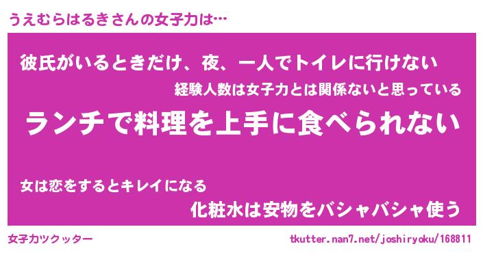 | 恥ずかしいあだ名 | 『プリティーうえむらはるき』『うえちん』 |
