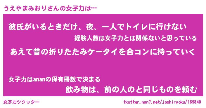| 恥ずかしいあだ名 | 『プリティーうえやまみおり』『うえちん』 |