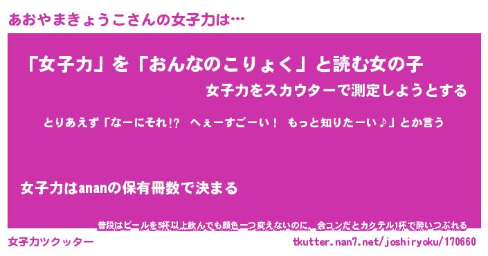 | 伝説のあだ名 | 『不死鳥のスナイパーあおやまきょうこ』 |
