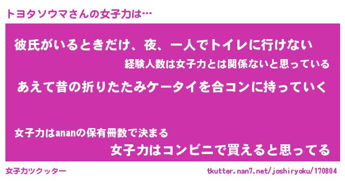 | 女子向けラノベタイトル風あだ名 | 『(仮)トヨタソウマのやんごとなき事情』 |