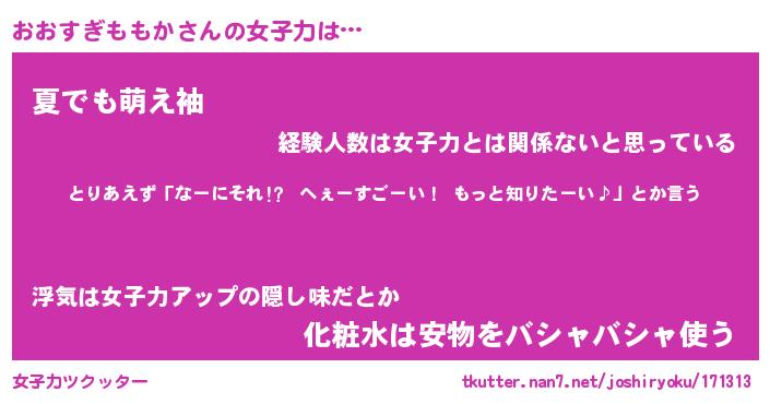 | 胡散臭い通販商品みたいなあだ名 | 『モテモテ間違いなし霊験あらたかなお札…その名も「おおすぎももか」』 |