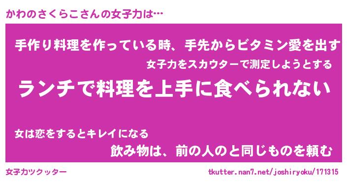 | ヘコむあだ名 | 『かわにゅー』『つくし』『かわ太郎』 |