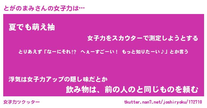 | 胡散臭い通販商品みたいなあだ名 | 『億万長者になれるブレスレット…その名も「とがのまみ」』 |