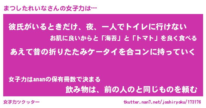 | 恥ずかしいあだ名 | 『プリティーまつしたれいな』『まつちん』 |
