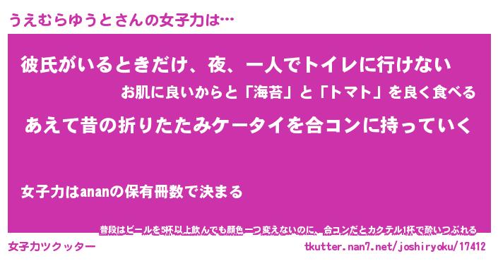| ヘコむあだ名 | 『うえっふぃ~』『豆乳』『うえ太郎』 |