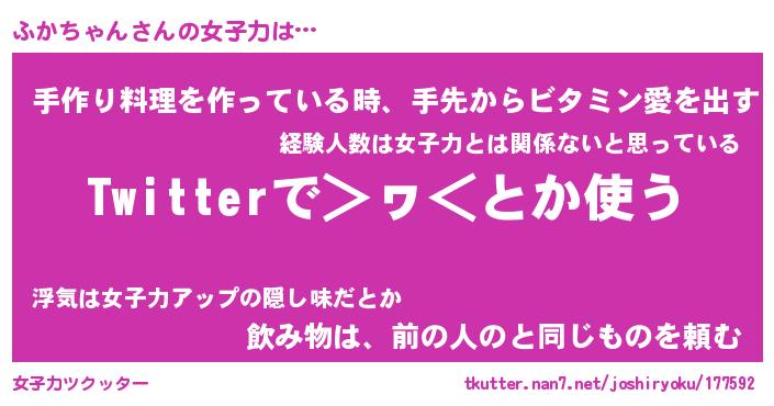 | ヘコむあだ名 | 『ふかっふぃ~』『つくし』 |