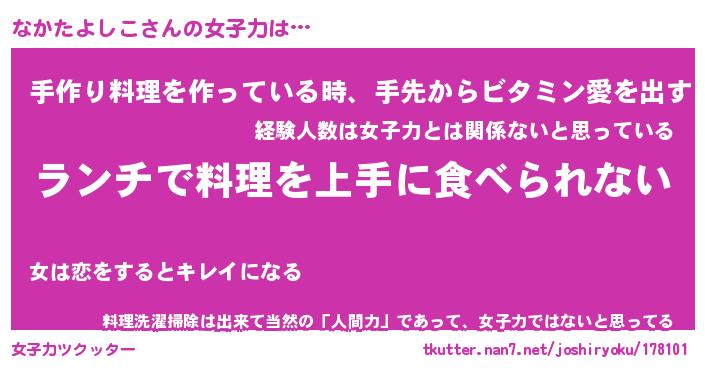 | 恥ずかしいあだ名 | 『プリティーなかたよしこ』『なかっちょ』 |