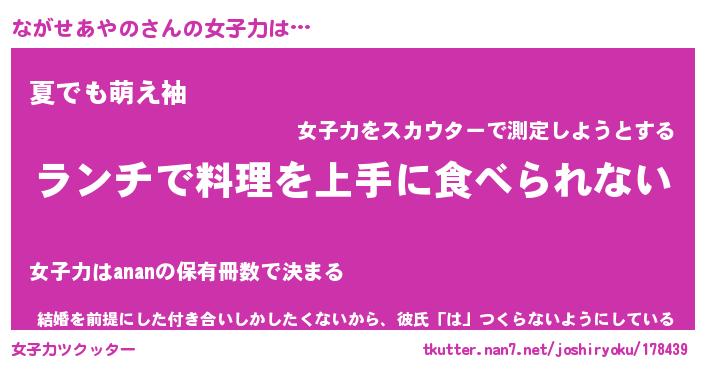 | 恥ずかしいあだ名 | 『プリティーながせあやの』『ながっちょ』 |