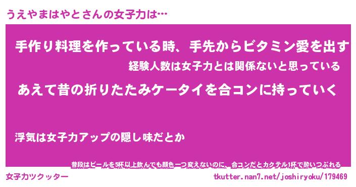 | 恥ずかしいあだ名 | 『プリティーうえやまはやと』『うえちん』 |