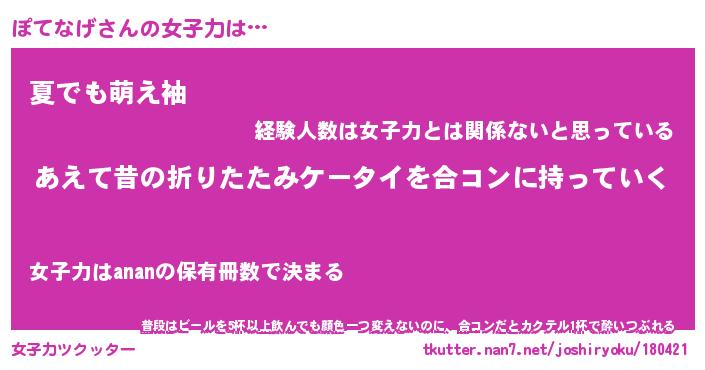 | 女子向けラノベタイトル風あだ名 | 『(仮)ぽてなげのやんごとなき事情』 |