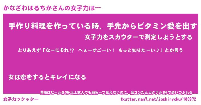| 女子向けラノベタイトル風あだ名 | 『誰かこのかなざわはるちかを説明してください! ~契約から始まるウェディング~』 |