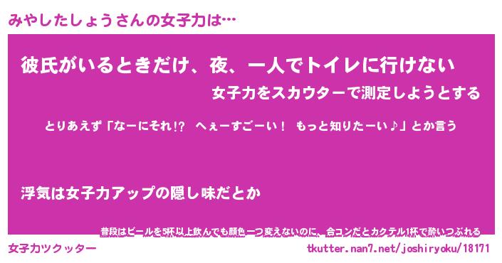| ヘコむあだ名 | 『みやにゅー』『豆乳』『みや太郎』 |