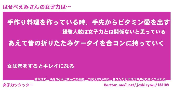 | 恥ずかしいあだ名 | 『プリティーはせべえみ』『はせっちょ』 |
