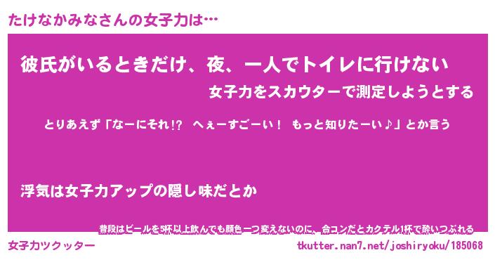 | 恥ずかしいあだ名 | 『プリティーたけなかみな』『たけっちょ』 |