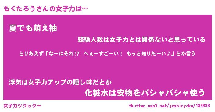 | ヘコむあだ名 | 『もくもー』『なまこ酢』『もくっぺ』 |