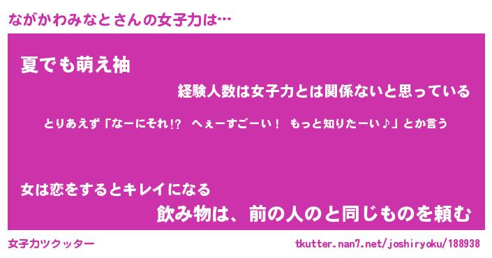 | 恥ずかしいあだ名 | 『プリティーながかわみなと』『ながちん』 |