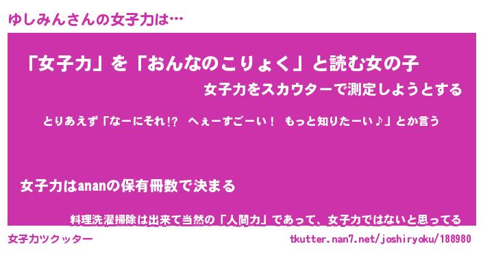 | 意味不明あだ名 | 『ペロリンゆしみん』『永久保存ゆしみん』 |