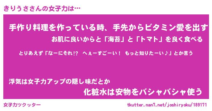| ヒーロー風カッコイイあだ名 | 『スーパーキリウサ』『魔戒騎士キリ』 |