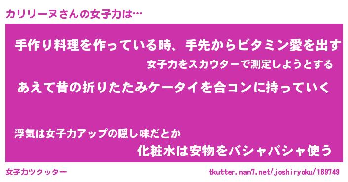 | ヒーロー風カッコイイあだ名 | 『スーパーカリリーヌ』『魔戒騎士カリ』 |