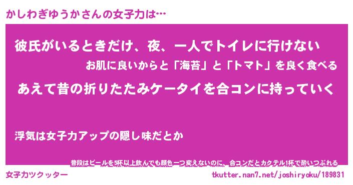 | 恥ずかしいあだ名 | 『プリティーかしわぎゆうか』『かしちん』 |